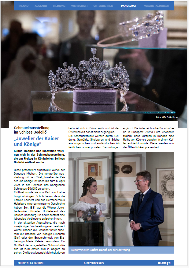 Die neue Sonderausstellung, die im Dezember 2025 im Königlichen Schloss Gödöllő eröffnet wird, widmet sich der faszinierenden Geschichte der renommierten kaiserlichen und königlichen Hofjuwelierdynastie A. E. Köchert mit Sitz in Wien. Gezeigt werden außergewöhnliche Schmuckstücke, von denen ein Großteil zum ersten Mal in Ungarn zu sehen sein wird. Die meisten Exponate befinden sich in Privatbesitz und sind der Öffentlichkeit nicht zugänglich. Die meisten Leihgeber gehören dem Adel an – aber auch Herrscher sind unter ihnen. Die Besucher:innen können diese sorgsam gehüteten Kostbarkeiten aus nächster Nähe bewundern und ihre faszinierenden Geschichten entdecken.