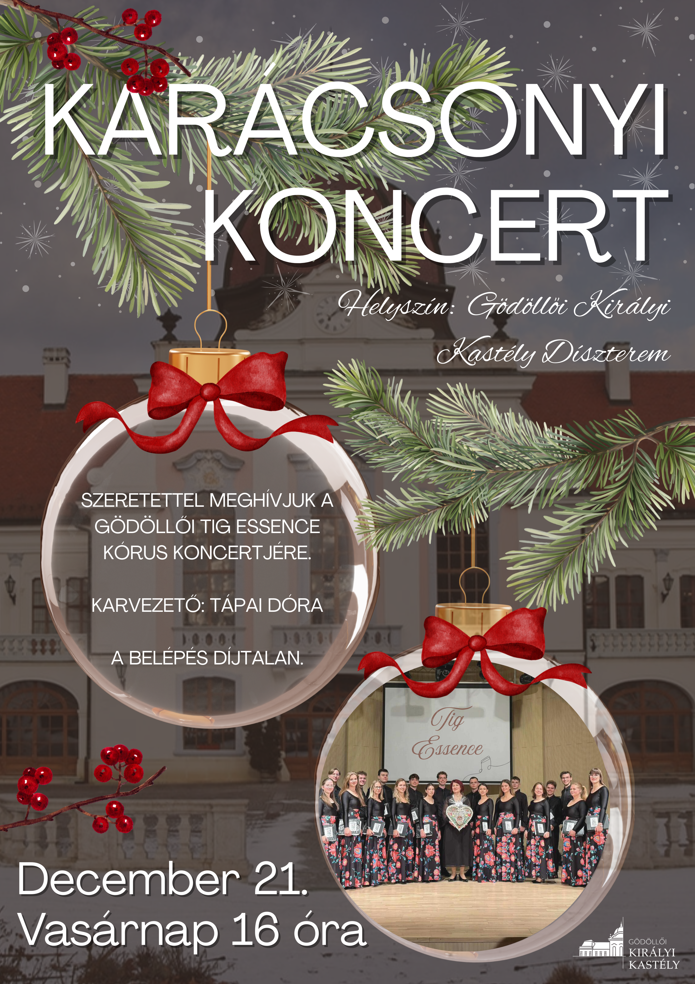 Az 1870-es években a királyi család előszeretettel töltötte Gödöllőn a karácsonyi ünnepeket. Az esztendő legbensőségesebb időszakában újra ünneplőt öltő királyi kastély ismét színes programokkal várja az érdeklődőket.   December 6-tól     A.E. Köchert, Császárok és királyok ékszerésze időszaki kiállítás     December 13. szombat – Advent a Kastélyban 13:00 Gödöllői ifjú tehetségeink kamarakoncert,                                                                                ingyenes              Műsor: Bach: F-dúr duett (BWV 803), Schubert: Arpeggione-szonáta,              Schubert f-moll Impromptu (op. 142 no. 4) Fauré: Elégia, F. Poulenc: Sonata.              Előadók: Ittzés Péter zongora, Botrágyi Flóra fuvola, Kertész Mátyás cselló 15:00 Az elveszett aranycsengettyű, a Holdfű Színház előadása                                                           ingyenes 19:00 Jövőre veled ugyanitt 2 – a legenda folytatódik                              jegyár: I. 7.900Ft, II. 6.900Ft, III. 5.900Ft            a Csillagfény Produkció színdarabja   December 14. vasárnap – Advent a Kastélyban 11:00 Kolompos Együttes gyermekkoncertje a Lovardában                                                      jegyár: 3.500Ft 13:00 Polyák Anita: Szívemnek gyöngyháza című színházi előadás,                                              ingyenes           mely a Petőfi Kulturális Program támogatásával jön létre 13.30 Királyi karácsonyok, családi múzeumpedagógiai program                                     belépőjeggyel látogató 14.00 Karácsonyról álmodók, a Lumen koncertje                                                                                ingyenes 15:00 Mesék a tejúton túlról, az Aranyszamár Színház előadása                                                      ingyenes 18:00 Hungaricus Együttes és barátainak koncertje pódiumbeszélgetéssel                                    ingyenes           (regisztráció szükséges) regisztráció: »ide kattintva«                                       December 6-7., 13-14. egész napos programok General Pausa Vegyeskar a Kastély karácsonyi kórusának koncertjei Kézművesek karácsonyi vására Játék a Kastélymakettben a Tourinform előtt mindkét hétvégén 10:00-15:00 között Trilla Manók, zenés szórakoztató vásári előadásai december 7-én és 14-én délután        Betlehemesek hagyományos bemutatói december 7-én,13-án,14-én Családi múzeumpedagógiai programok részvételi díja: 3-6 éves korig: 2.200 + 1.000 Ft, 6-18 éves korig: 2700 Ft + 1.000 Ft, felnőtt belépőjegy: 5.400 + 1.000 Ft     December 20. szombat 19:00  A Gödöllői Cavaletta Női Kórus ünnepi hangversenye         jegyár: 3.500Ft                                                    Györe Zoltán: Missa Intima – Jazz mise ősbemutató   December 28. vasárnap 10.00-17.00  Erzsébet királyné karácsonyai címmel egész napos családi rendezvényünkre várjuk az érdeklődőket. A nap során interaktív programokkal, játékokkal és kézműves alkotótevékenységgel idézzük meg a királyi karácsonyok hangulatát, még Erzsébet királynéval is lesz lehetőség találkozni.